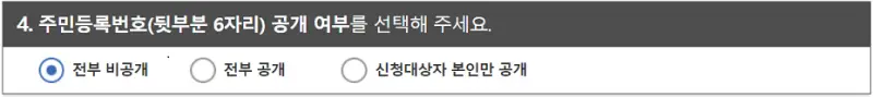 👉 주민등록번호 뒷자리 6자리에 대한 공개 여부를 선택합니다. 공개를 필요한 경우도 있고, 비공개해야 하는 경우도 있습니다. 가족관계증명서에 대한 제출 조건을 확인하고, 공개 여부를 선택하세요.