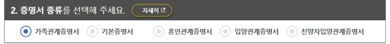 👉 발급받으려는 증명서의 종류를 가족관계증명서로 선택하세요.