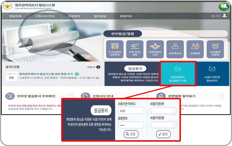 ▼ 취업예정자 명의의 인증방식을 선택하여 로그인을 합니다. 메인 화면에서 '취업예정자 발급동의 신청'을 선택합니다. 취업대상 시설에서 받은 시설 ID, 검증번호를 입력합니다. '조회'를 선택합니다. 검색된 시설이 취업대상 시설이 맞는지 확인하고, 동의를 선택합니다.