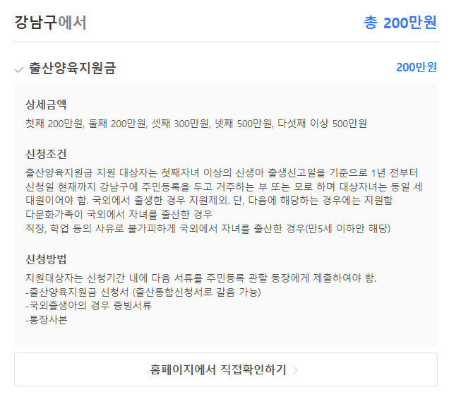 서울 강남구, 첫째 아이를 예시로 입력해보았습니다. 총 3,320 만원을 지원 받을 수 있다고 나오네요!
