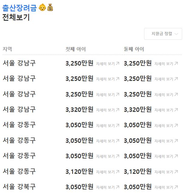위와 같이 지원금 많은 순 또는 적은 순으로 지역별 육아 지원금을 확인해볼 수 있습니다. 여기서 자신이 살고 있는 지역을 찾으려면, CTRL + F 를 눌러 자신이 사는 지역을 검색해서 찾아볼 수 있어요. 세부 내용을 확인하고 싶다면, 옆에 '자세히 보기'를 클릭해서 들어갑니다.