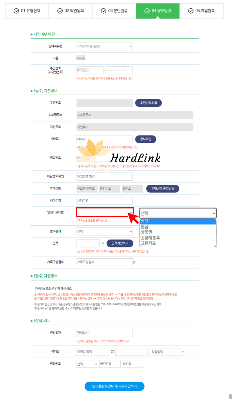 회원 기본 정보를 입력합니다. 인센티브 유형에는 현금, 상품권, 종량제봉투, 그린카드를 선택할 수 있습니다. 본인이 원하는 인센티브를 선택합니다. 단, 해당 지자체에서 제공하는 인센티브 유형을 확인해야 합니다.