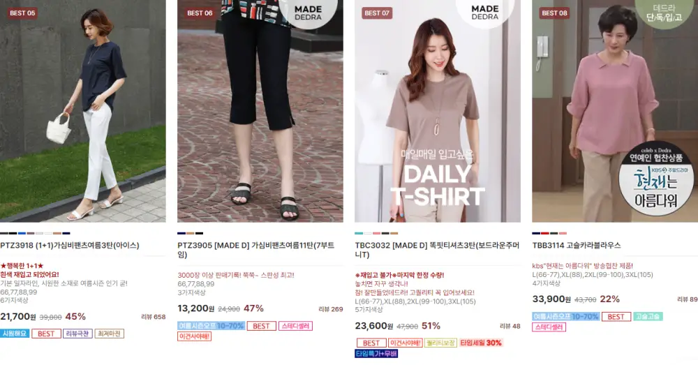 데드라(http://www.dedra.co.kr/)는 40대, 50대, 60대 여성 의류를 판매하고 있어요. 품격 있고 우아한 중년 여성을 위한 의류가 많아요. 플러스 사이즈 페이지에는 99 size까지 큰 사이즈의 의류를 판매하고 있어요. 시니어 선물관 페이지에서는 중년 여성에게 선물할 수 있는 다양한 의류를 찾아볼 수 있어요.