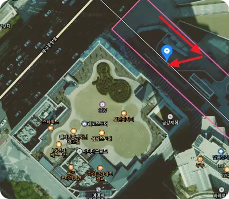 위 지도에서 빨간색 화살표 처럼 이동하면, CGV 출입구를 찾을 수 있어요. 갤러리아 백화점을 돌아서 갤러리아 백화점과 수원 컨벤션 센터 사이의 계단으로 내려가서, 바로 우측으로 돌면 출입구가 있어요.